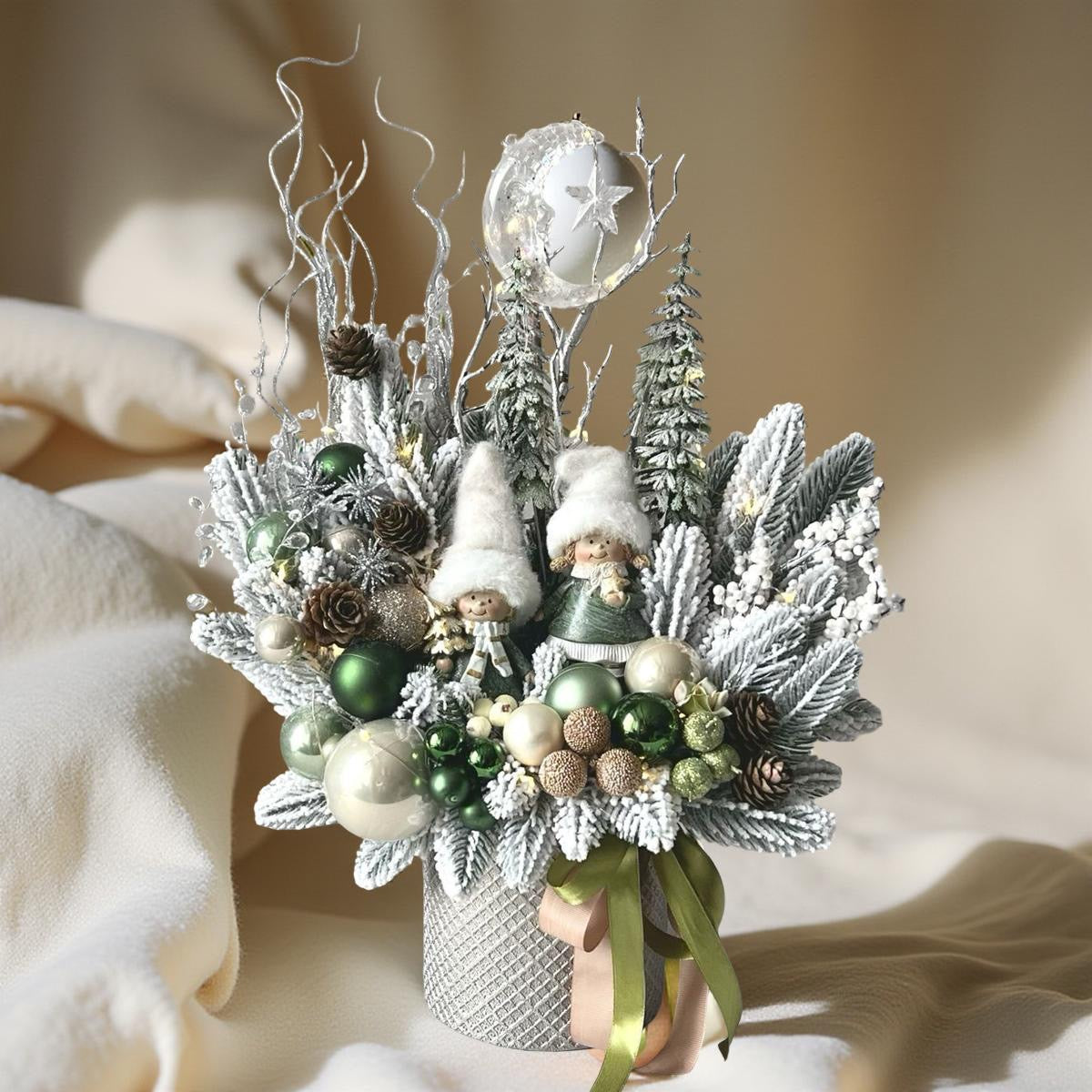 Un aranjament de iarna delicat, realizat in nuante fine de roz mate si sidefate, cu globuri catifelate, crengute inghetate si accente argintii stralucitoare. Baza din catifea roz si detaliul tricotat adauga caldura, feminitate si un aer modern, perfect pentru decorul sarbatorilor. Este cadoul ideal pentru cei care iubesc eleganta subtila si decoratiunile rafinate de sezon. O piesa care aduce magie, lumina si emotie in orice incapere.