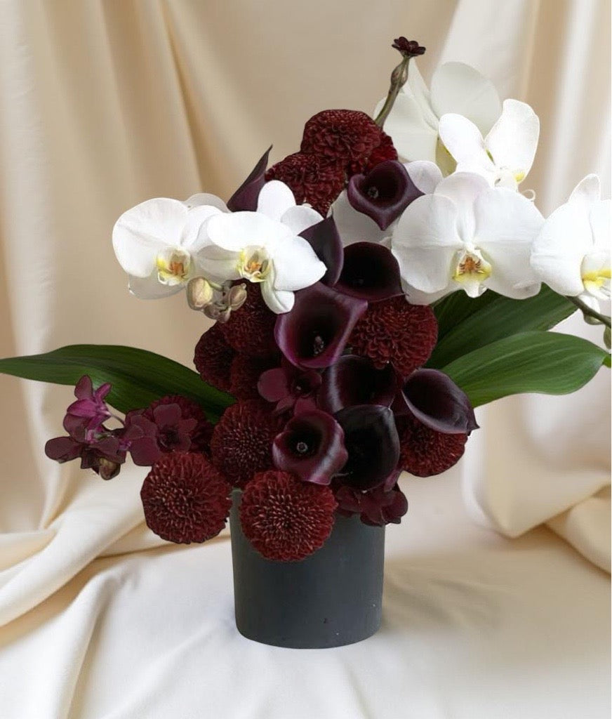 Aranjament floral premium în nuanțe contrastante de burgundy închis și alb imaculat, compus din calla neagră, orhidee albă și flori texturate burgundy, montate într-un vas modern negru. Un design sofisticat, artistic, perfect pentru decor interior elegant, cadouri corporate, showroom-uri sau surprize memorabile. Livrare rapidă în București, prezentare couture și impact vizual garantat.