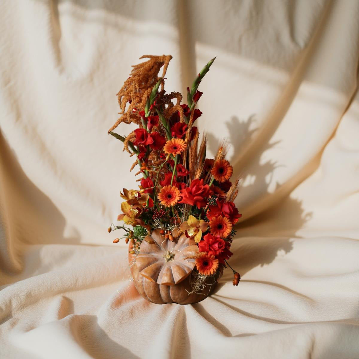 Aranjament în Dovleac Decorativ cu Flori de Toamnă
