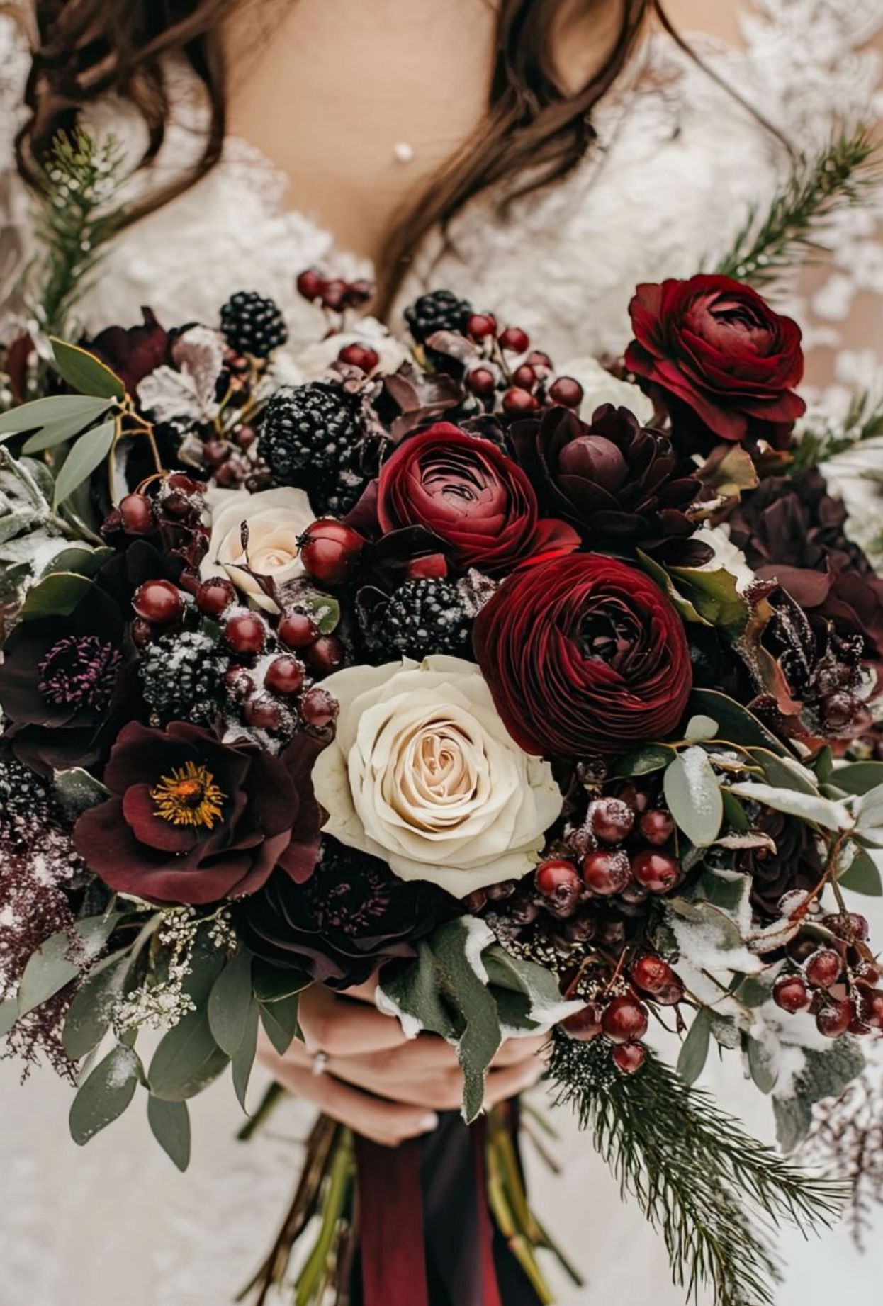 Un aranjament floral de nuntă cu o prezență absolut seducătoare — burgundy intens, nuanțe stinse de roz pudrat și alb cremos, completate de ranunculus, trandafiri, anemone și accente de fructe de pădure cu textură bogată.