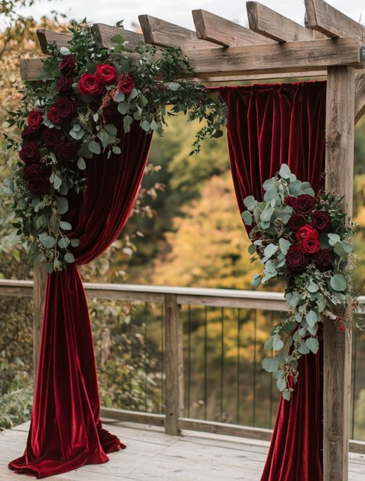 O piesă statement pentru ceremonie, construită pe structură din lemn și îmbrăcată în catifea bordo profundă. Trandafirii burgundy se contopesc cu frunzișul dens, oferind o estetică premium, elegantă, cu impact vizual puternic. Perfectă pentru cupluri care își doresc un moment “I DO” încărcat de rafinament și dramă romantică.