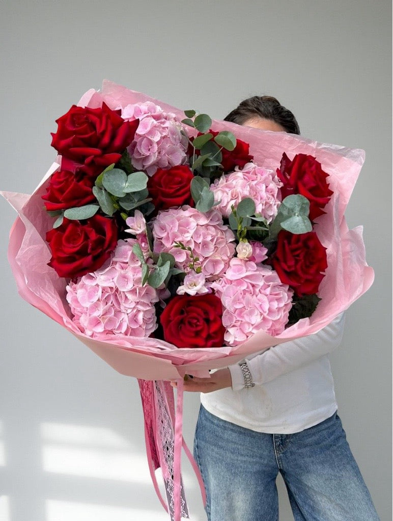 Un buchet premium plin de impact vizual, creat din hortensii roz voluminoase, trandafiri roșii intens și accente de verdeață. Un mix perfect între romantism și eleganță, ideal pentru aniversări, surprize speciale, gesturi memorabile sau declarații de iubire. Livrare rapidă în București, prezentare luxury și atenție la fiecare detaliu.
