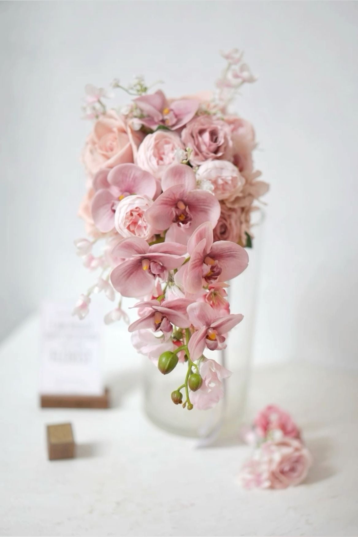 Un buchet spectaculos, creat în nuanțe fine de roz pudrat, în care orhideea roz devine protagonista absolută. Trandafirii premium de grădină completează perfect textura și rafinamentul, iar florile delicate aduc acel efect couture, potrivit pentru o mireasă care iubește feminitatea și detaliile luxoase. Ideal pentru o nuntă elegantă, rafinată și modernă – un buchet care arată impecabil în fotografii și transmite delicatețe, puritate și stil fără efort.