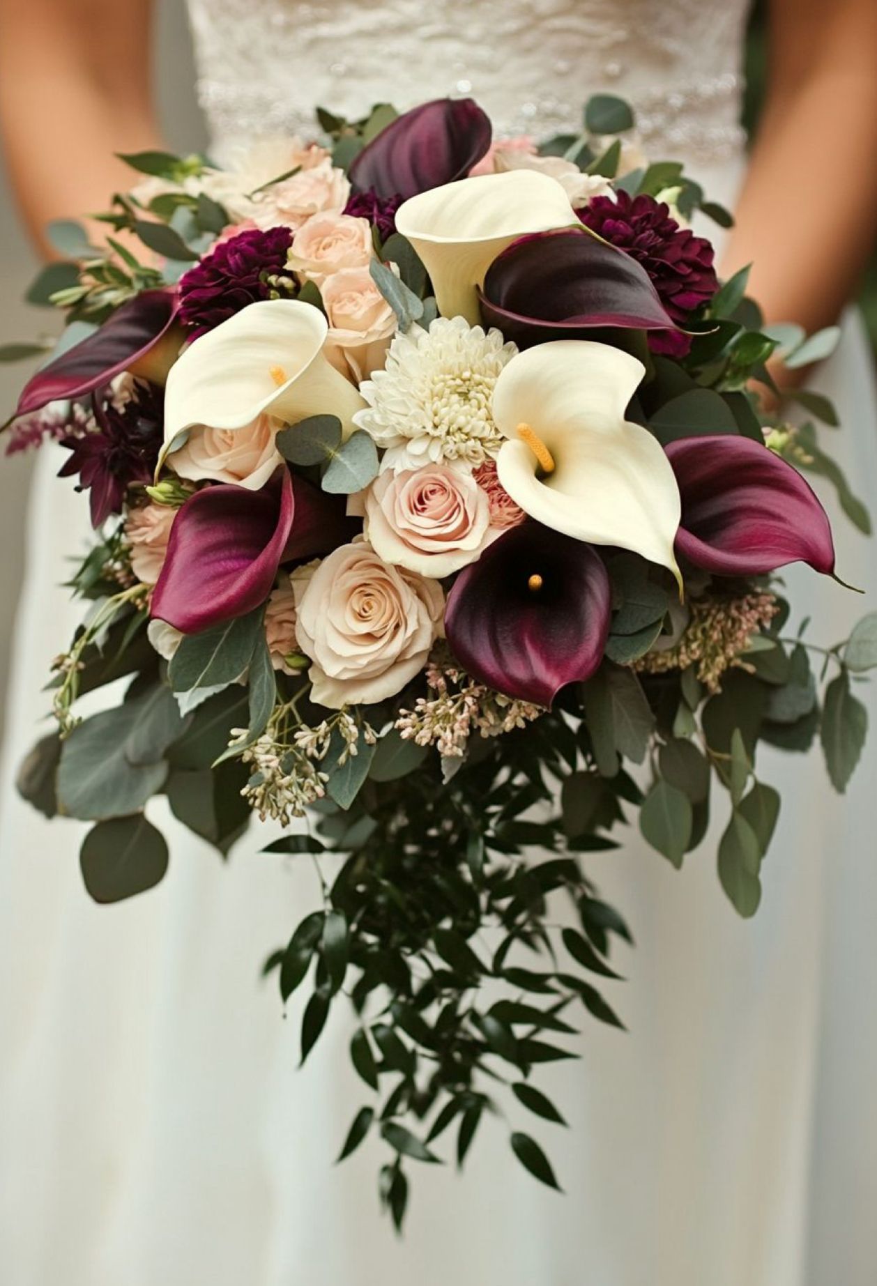 Un buchet dedicat nașei care vrea să transmită eleganță pură, fără compromis. Crinii calla burgundy se îmbină cu nuanțe nude – o combinație rar folosită, dar extrem de sofisticată, perfectă pentru ținute satin, rochii închise la culoare sau tonuri neutre. Mixul floral este completat de trandafiri în bej fin, accent de dalii în tonuri mov intens și texturi botanice naturale, care oferă volum, profunzime și un aer couture.