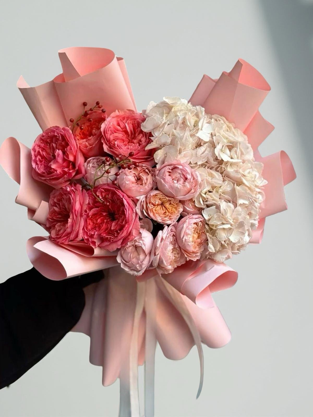 Un buchet modern, romantic și rafinat, realizat din trandafiri de grădină în nuanțe roz și hortensii delicate ivory, finisat într-un ambalaj couture roz cu panglică satinată. Perfect pentru aniversări, surprize romantice, gesturi elegante și cadouri memorabile. Livrare rapidă în București, prezentare premium și atenție la fiecare detaliu.