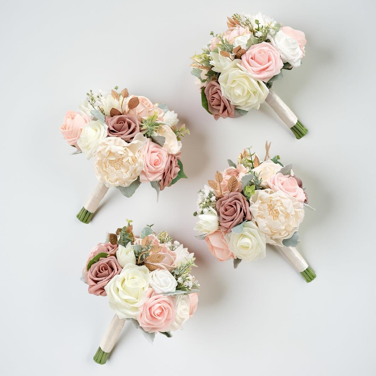 Set de cocarde pentru domnișoarele de onoare în nuanțe ivory, nude blush și taupe, lucrate cu trandafiri fini, hortensie premium și detalii botanice discrete. Este o paletă cromatică modernă, neutră, care se așază impecabil atât lângă o rochie nude, cât și lângă tonuri sidefate sau pastel. Se integrează firesc în conceptul vizual al miresei, oferind unitate, coerență și un plus de eleganță în toate fotografiile zilei.