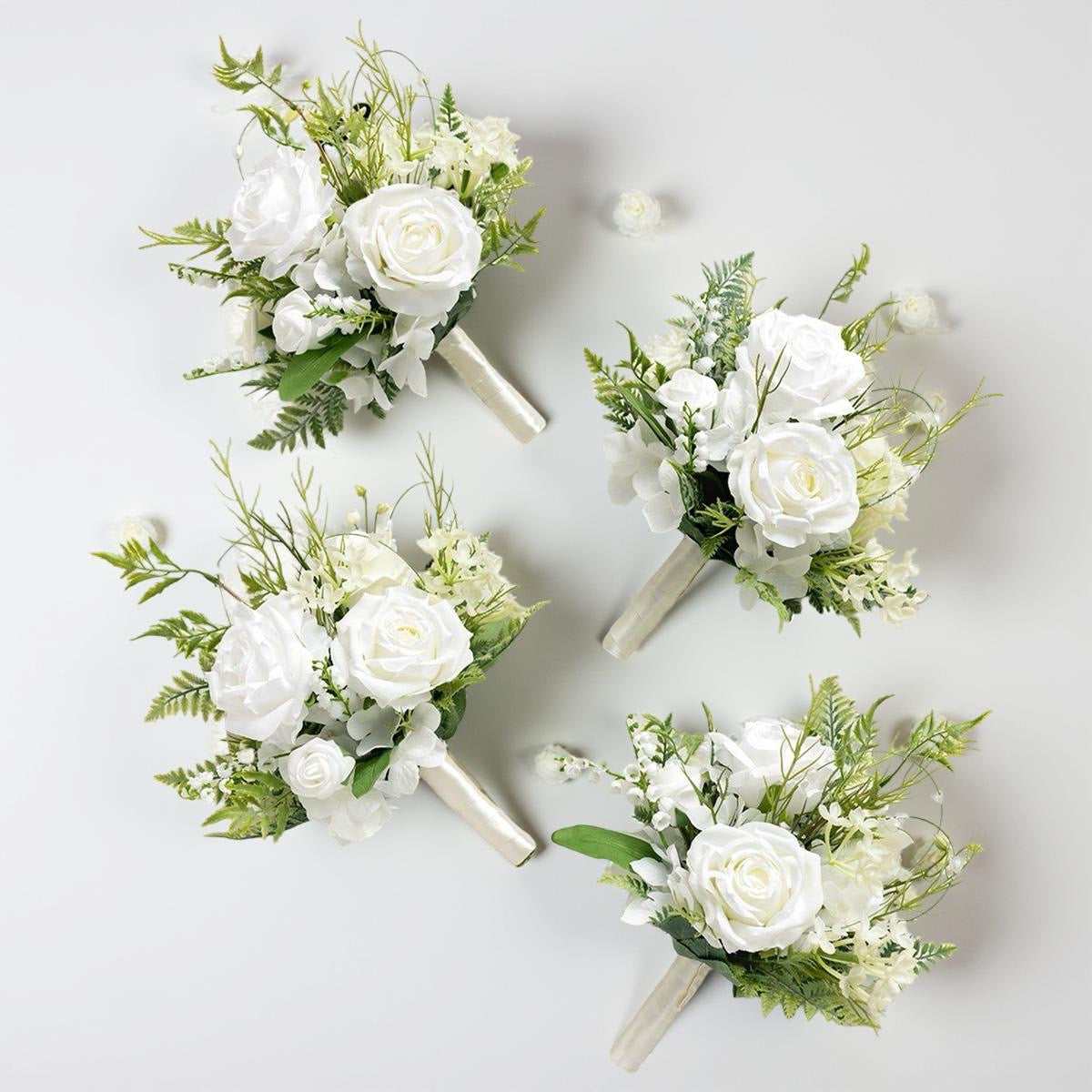 Set de cocarde în tonuri imaculate de alb, realizate cu trandafiri fine premium și accente de hortensie, completate de verdeață aerisită pentru un look fresh și sofisticat. Eleganța pură a albului creează unitate vizuală perfectă între mireasă și entourage, fiind alegerea ideală pentru nunți clasice, moderne sau minimaliste. Fiecare cocardă este gândită să se potrivească impecabil în fotografii, să adauge rafinament și să sublinieze stilul evenimentului fără să concureze cu buchetul miresei.