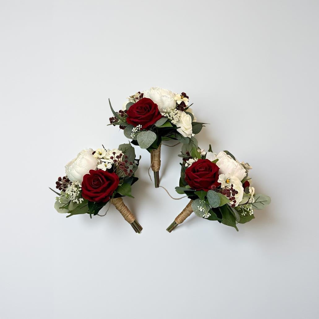 Cocarde realizate manual pentru domnișoarele de onoare, cu trandafiri roșii catifelați și trandafiri albi cremoși, accentuate cu verdeață premium și detalii fine. Un mix care păstrează tema cromatică a miresei, oferind unitate vizuală în fotografii și un plus de eleganță la fiecare apariție. Un accesoriu discret, dar cu prezență, potrivit pentru orice concept de nuntă cu tentă clasică, rafinată sau romantică.
