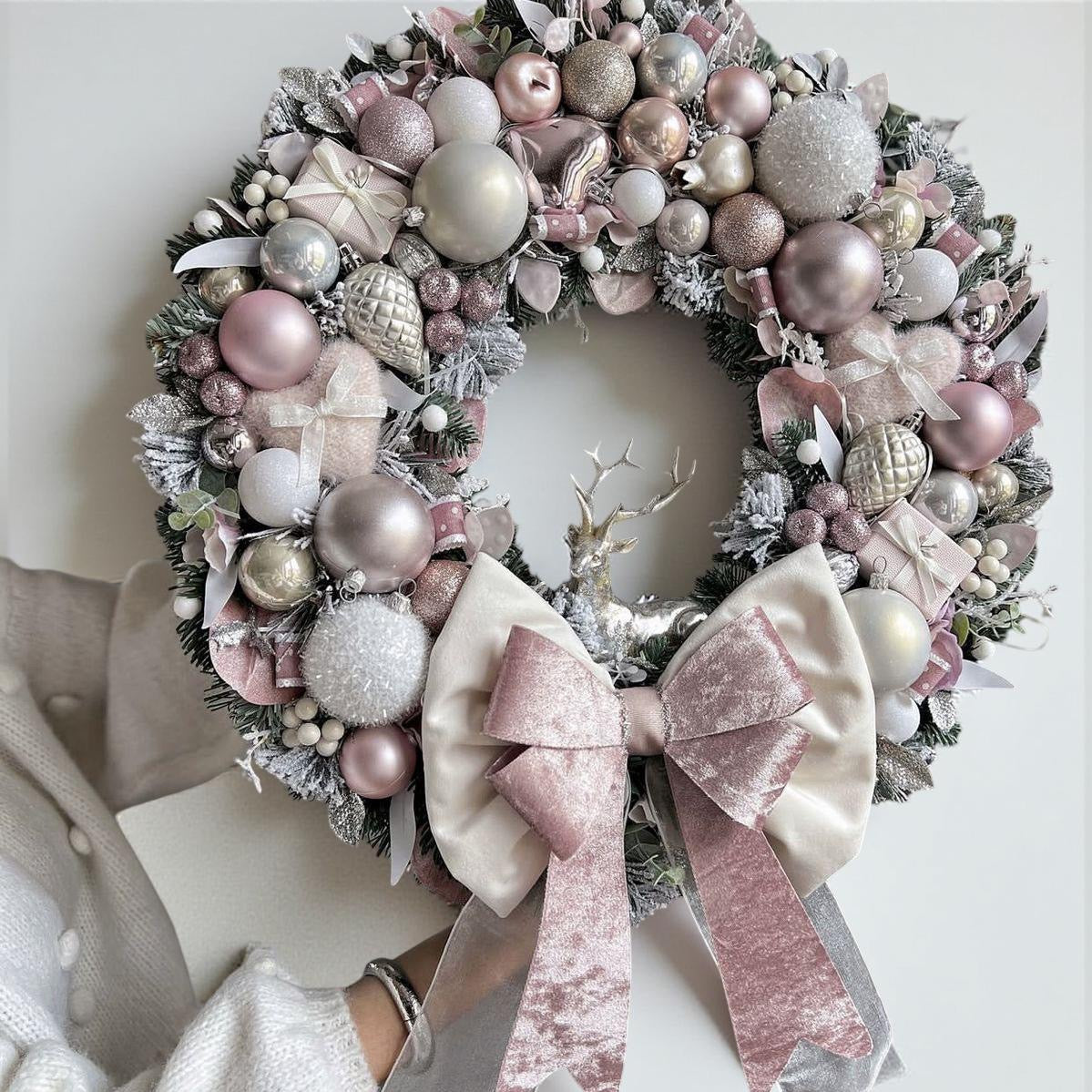 O coronita de Craciun rafinata, creata in tonuri de roz pudrat, argintiu si alb perlat, decorata cu globuri lucioase, flori elegante si accente inghetate. Modelul este definit de o funda generoasa din catifea roz si satin ivoire, care ii ofera o nota luxoasa si feminina. In centrul compozitiei se afla un ren argintiu miniatural, adaugand farmec si magie de sezon. O piesa statement, perfecta pentru decorul de la intrare, living sau pentru a fi oferita ca un cadou premium unei persoane speciale.