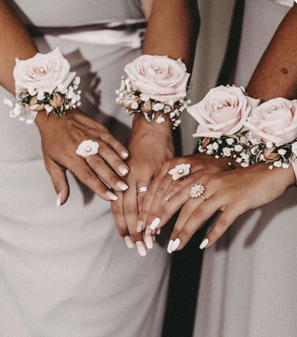 O abordare foarte fină și rafinată pentru domnișoarele de onoare — corsaje florale create pe trandafiri pudrați, accente delicate de boboci și gypsophila, în nuanțe neutre și romantice.