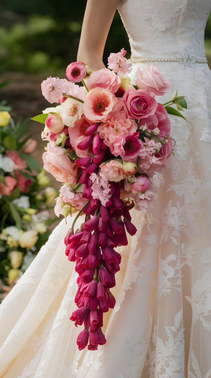 Un buchet spectaculos, în nuanțe de roz pudrat și fucsia intens, cu flori luxuriante care coboară fluid într-o cascadă dramatică. Ranunculus, trandafiri și bujori roz sunt împletiți cu flori de accent și terminați cu o curgere bogată de flori fucsia, creând un efect couture, sofisticat și memorabil. Alegerea perfectă pentru o mireasă care dorește un buchet statement.
