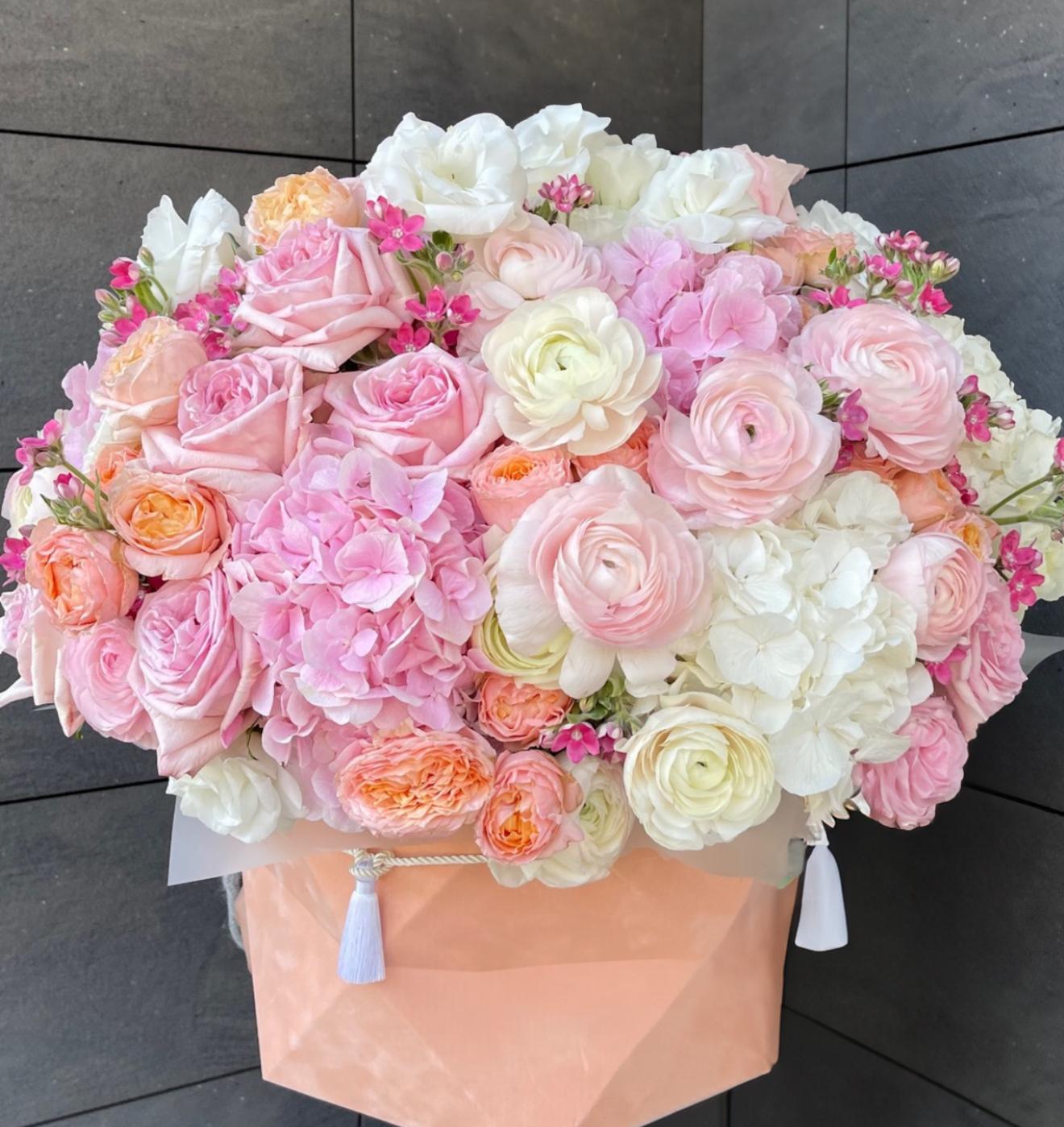 TRANDAFIRI, RANUNCULUS ROZ/ALB HORTENSII BUJORI/TRANDAFIRI, MINI ROSE , CUTIE PERSONALIZATA