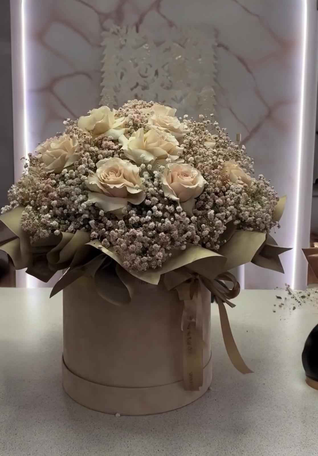 TRANDAFIRI, GYPSOPHILA, FRUNZE DECORATIVE, CUTIE PERSONALIZATA