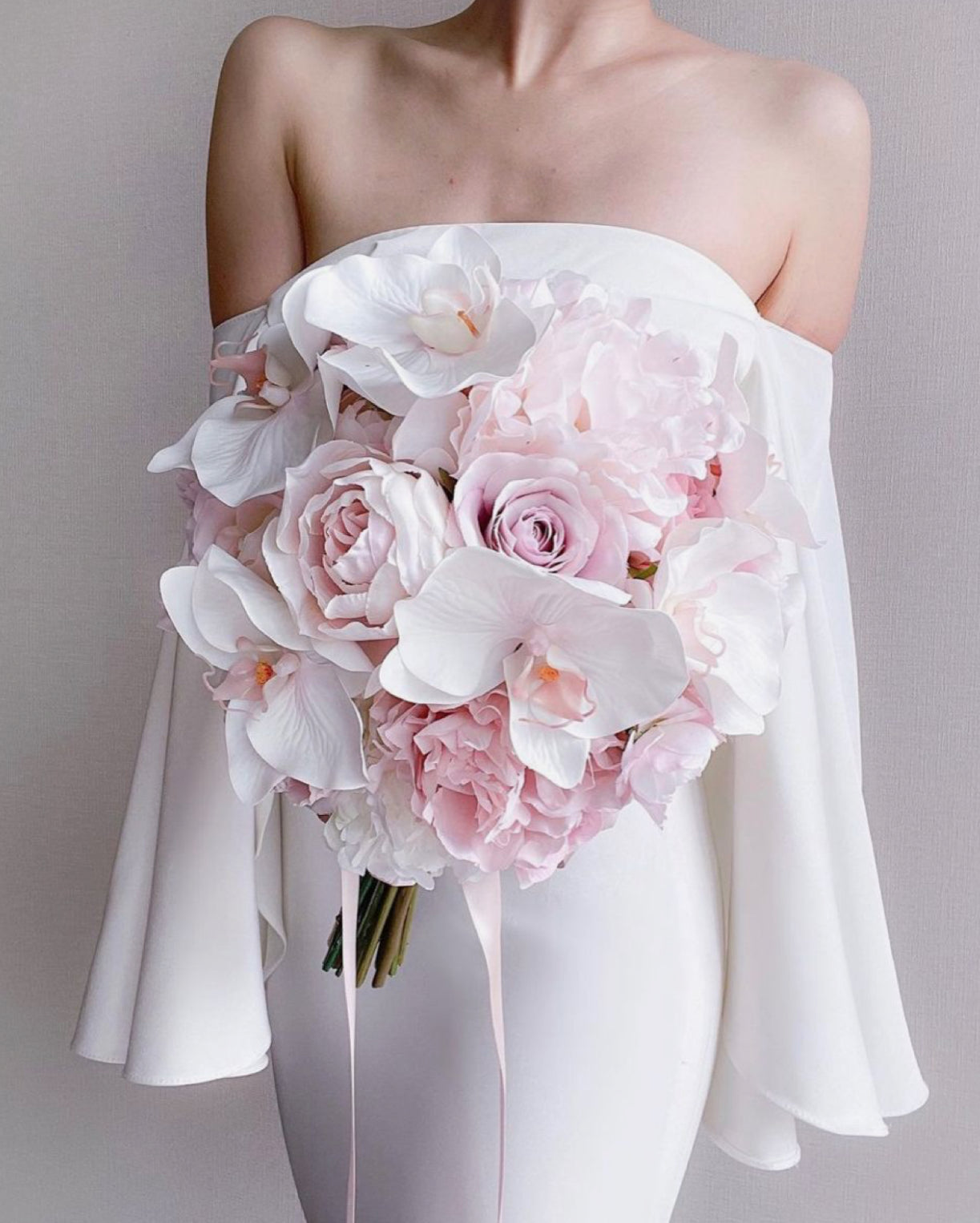 Un buchet modern și rafinat, în tonuri delicate de roz blush și alb imaculat. Trandafirii roz pal și bujorii vaporoși sunt armonizați cu orhidee Phalaenopsis albe, pentru un contrast subtil și elegant. Designul curat, aerisit și couture îl face alegerea ideală pentru mireasa sofisticată care iubește frumusețea discretă și detaliile atemporale.